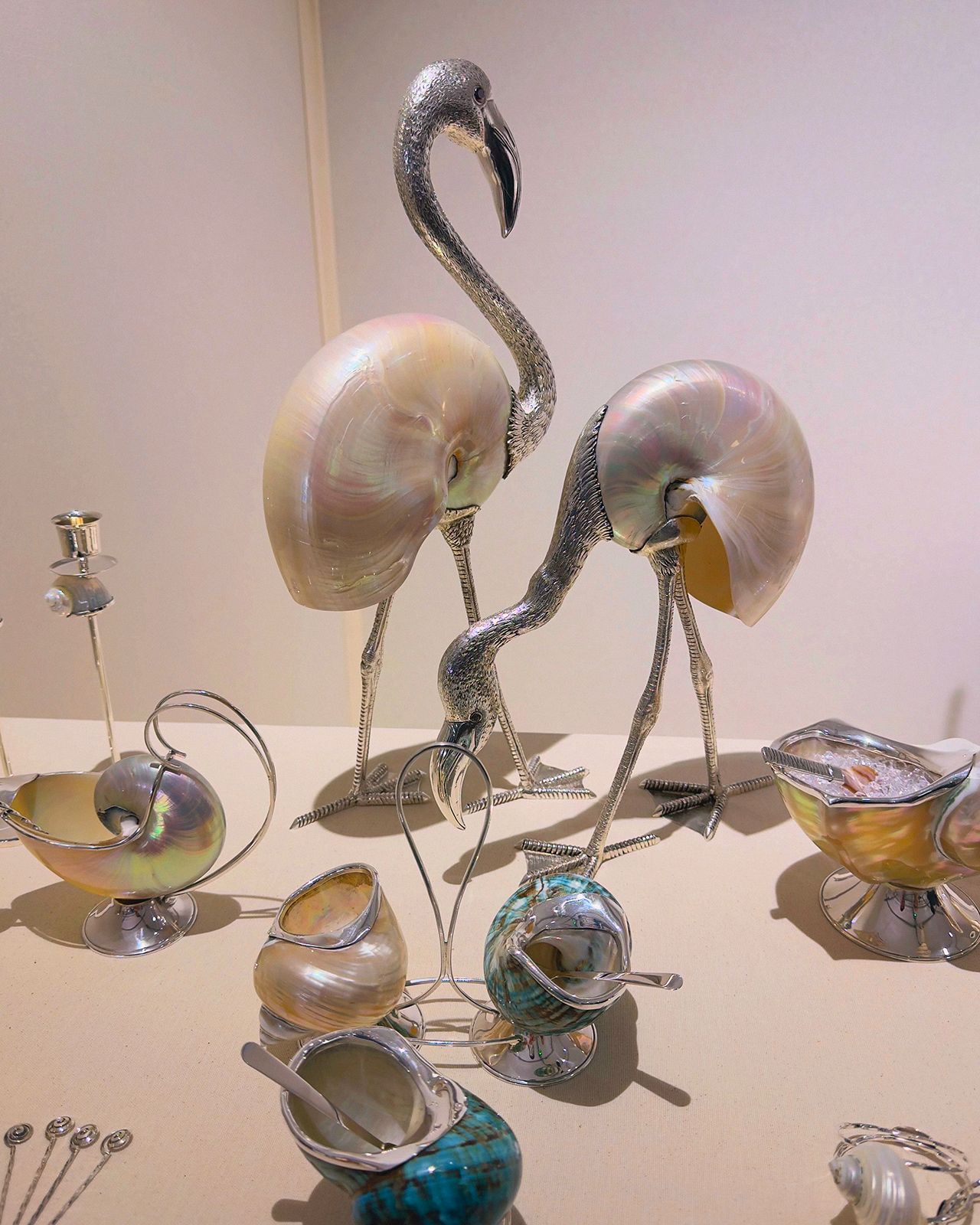 My personal favorites of this year’s event were Marimekko, which came with a burst of colorful fabrics, the space a conceptual reinterpretation of their Helsinki print archive with an opportunity to engage with original fabric swatches. Challengers and Call Me by Your Name director Luca Guadagnino partnered with Lobmeyr to create a presentation like a scene in a film. Drawing on his experience with framing and atmosphere, he created a space where every detail is directed to create a specific unforgettable feeling rather than a generic showroom. Then I came across Tavares 1922, a century-old Portuguese high jewelry house from Póvoa de Varzim. They blend traditional craftsmanship with modern design to create refined, heritage-rich pieces. They showcased a collaboration with designer Omer Gilony, The Bird Edit, which transforms natural shells into surreal silver-legged “bird” sculptures. The pieces were silly and delightful and gorgeous, it’s really a winning combination for me.